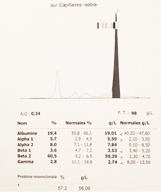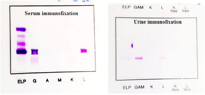An 80-year-old female patient with a history of hypertension referred to the rheumatology department with a 20-day history of progressive disabling monoarthralgia and knee swelling. Hypertension was diagnosed 10 years ago. There were no other chronic comorbidities such as diabetes mellitus, renal disease, recurrent urinary tract infections, chronic alcoholism, or pre-existing joint damage such as chronic arthritis and prosthetic joints. At the admission the patient presented with a 10-day history of general malaise and fever. She also gave a five-day history of a painful and swollen right knee unrelated to trauma. Acute monoarthritis in adults can have many causes, but crystals, trauma, and infection are the most common. A diagnostic aspirate of the knee joint yielded minimal clear synovial fluid. Investigations showed normochromic normocytic anemia with a hemoglobin of 54 g/l, white cell count of 13.11×109/l (4.0–10.0×109/l) and platelets of 278×109/l and a grossly raised erythrocyte sedimentation rate (>140 mm/hr). She was hypercalcemic (corrected calcium 132 mg/l), phosphate 65.5 mg/l, alkaline phosphatase 46 U/l (40–150 U/L) with normal liver function (ALT 7 U/l, AST 8 U/l, normal bilirubin). Significant renal disease was evident urea 1.36 g/l (0.13–0.43 g/l), creatinine 20.8 mg/l (6–13 g/l), uric acid 111.8 mg/l (26–60 mg/l), proteinemia 97 g/l (60–80 g/l) and β2-microglobulinemia 59.29 mg/l (0.5–2.4 g/l). Here albumin was 19 g/l (40–50 g/l), Fibrinogen 4.30 g/l (2.0–4.0 g/l) and C-reactive protein was 149.4 mg/l (0.0–5.0 mg/l). Acute monoarthritis was caused by a crystal deposition of uric acid. Immunoturbidimetric analysis showed that monoclonal hypergammaglobulinemia was due to the increase of IgG with the value of 28.96 g/l (8–16 g/l). Serum protein electrophoresis revealed a big paraprotein band (98 g/l) (Figure 1). Serum immunofixation showed the presence of an IgG-Lambda gammopathy (Figure 2). Urine immunofixation showed also the presence of an IgG-Lambda gammopathy (Figure 2). A bone marrow smear revealed that 37% of plasma cells were dystrophic. Bone X-ray of the skull showed multiple lytic lesions. Multiple myeloma was diagnosed by examining of bone marrow aspiration and biopsy showing the existence of plasma cells infiltration and plasmacytosis with 32% malignant plasma cells. Thus a diagnosis of MM stage III of the International Staging System was made. | ||||||