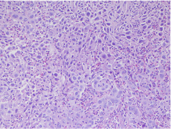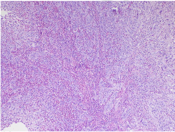 Microscopic examination of the biopsied specimen of the tumor revealed sheets of large cells with abundant inflammatory infiltration consisting predominantly of eosinophils and lymphocytes characterized by large nuclei with prominent nucleoli. Cells showed a moderate amount of granular or clear cytoplasm. We observed a high mitotic rate and many abnormal mitoses and distinct cell membrane stained well by PAS stain. Finally, the presence of necrosis area was noted. The pathological diagnosis of glassy cell carcinoma was made (Figure 1) (Figure 2) (Figure 3).