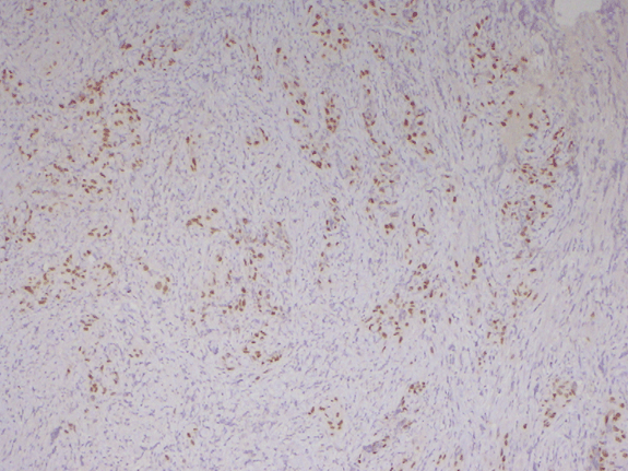 Gynecological examinations revealed a circumscribed, ulcerated tumor originating in the vaginal wall. This tumor was occupied the upper and middle third of vaginal wall. The uterine cervix and parameters were apparently intact. Inguinal lymph nodes were not evident.