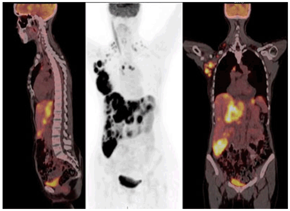 Figure 1: Fused PET/CT scan of patient at time of initial presentation. FDG uptake is demonstrated in the breast, axilla, liver, internal mammary and supraclavicular lymph nodes. The middle image is a maximal intensity projection of FDG uptake by in the coronal plane. There is a notable lack of bone metastases in these images.