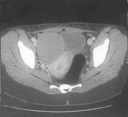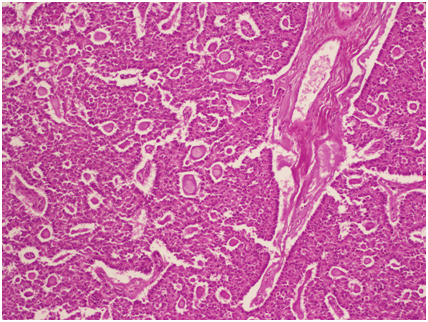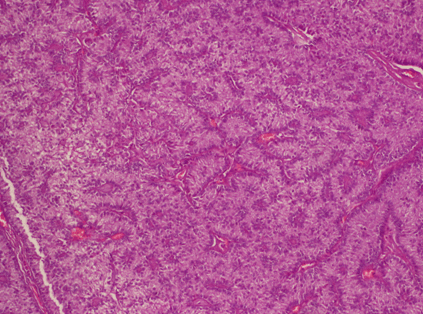 A 32-year-old female presented with a family history of PJS. The patient presented in 2011 an adnexal mass. Physical examination revealed perioral-pigmented macule (Figure 1). In laparotomy, we discovered a left adnexal mass and an intestinal polyp. No ascites or lymph nodes were reported. The contralateral ovary was normal. The patient underwent a conservative staging including a left oophorectomy. No contralateral adnexal biopsy was performed. Histologic finding confirmed SCTAT associated to PJS intestinal polyp. The ovarian tumor were classified FIGO IA. Subsequently, the patient did not receive adjuvant therapy. Five years later, she presented with abdominal pain. Computed tomography scan shows a 75 mm right adnexal mass evoking a cystic recurrence (Figure 2). The serum rate of anti-müllerian hormone (AMH) was elevated and measured 325 ng/ml. CA-125 rates were less than 35 UI/ml. In order to investigate PJS, a colonoscopy was performed and showed recto-colic polyposis. Mammogram showed benign cystic lesion of the breast. Papa smear did not show any abnormal cells. Radical surgery was recommended but the patient refused because of her will of childbearing. Laparoscopic exploration found a right adnexal cystic mass (Figure 3), with no evidence of ascites or peritoneal carcinosis. We underwent a cystectomy; leaving an ovarian tissue. The histologic findings showed circumscribed columnar epithelial nests composed of ring shaped tubules, which are encircled by hyalinized basement membrane-like material and concluded for a recurrent SCTAT. No mitotic count was reported (Figure 4) and (Figure 5). One month after surgery, hormonal rates were measured after ovarian stimulation and did not show hormonal activity. Fertility preservation attempt was a failure and the patient is proposed for a complementary surgery. The recurrence of SCTAT in young patient with PJS is a common event. Conservative surgery is always a challenge. We attend to find the best alternative to treat them. | ||||||