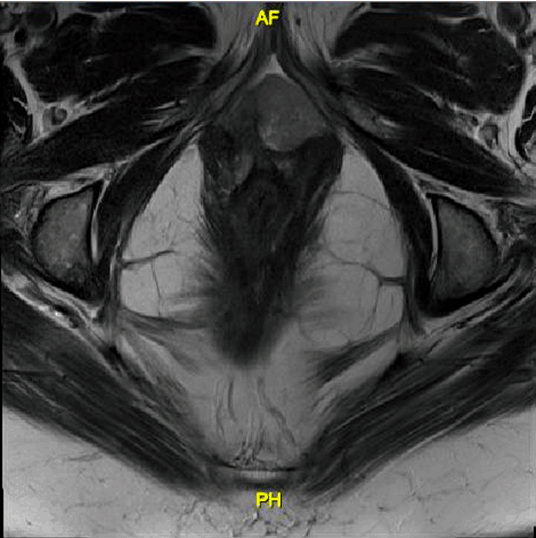 A 57-year-old female presented with complaint of abnormal vaginal drainage and was found to have a vaginal mass measuring about 3–4 cm. Her past medical history was significant for stage III colon cancer treated with surgical resection and adjuvant chemotherapy with no evidence of recurrence. She denied family history of skin cancer or gynecologic malignancy. Social history was significant for 10 years of tobacco use. Biopsy of the lesion showed a high-grade malignant neoplasm consistent with melanoma. Immunohistochemical analysis of this specimen was positive for S-100, HMB45, MART-1, weakly positive for CAM 5.2 and negative for P16, P63, CK-7, CK-20. The patient was referred to gynecologic oncology for further evaluation. Pelvic examination demonstrated a 4-cm mass replacing the anterior distal vaginal mucosa and urethra. On pelvic MRI scan, a lobulated soft tissue mass measuring 2.4x1.8x2.9 cm extending from the posterior wall of the left vaginal fornix and prolapsing inferiorly into the vaginal canal was present. The mass appeared to infiltrate into the left vaginal forniceal wall superiorly (Figure 1). Whole body PET scan demonstrated an intensely hypermetabolic left anterolateral vaginal lesion measuring 2.8x2.1 cm consistent with a neoplastic process with no inguinal or pelvic lymphadenopathy. Since these images showed no evidence of metastatic disease, malignancy was presumed to be of primary vaginal origin. The patient underwent a bilateral inguinofemoral lymphadenectomy and bilateral pelvic lymphadenectomy with negative nodes followed immediately by a total pelvic exenteration to ensure negative surgical margins with resection of pubic bone, colostomy and diverting ileal urinary conduit. Intraoperative findings were significant for 4–5 cm exophytic anterior vaginal mass located 1 cm left of the urethra (Figure 2). Frozen section of the resected bilateral inguinofemoral and pelvic lymph nodes were negative for malignancy. Final pathology demonstrated a 3.5cm melanoma with ulceration invading into the posterior wall of the vagina to a maximum depth of 20 mm. Based on these findings, the patient had AJCC stage IIC disease. There was no evidence of metastasis to the inguinal or pelvic lymph nodes bilaterally. The bladder, anus, rectum, urethra, cervix, uterus, ovaries were negative for malignancy. Following a consultation with medical oncology, she was started on adjuvant chemotherapy with temozolomide 200 mg/m2/d. Days 1–5 plus cisplatin 75 mg/m2 IV divided into three days, repeated every three weeks for six cycles. After cycle #5, she received 20% dose reduction of cisplatin due to thrombocytopenia. After completion of six cycles, PET/CT demonstrated no metastatic disease. Six months following the completion of chemotherapy, hypermetabolic activity was noted within the liver on a surveillance whole body PET scan, and subsequently confirmed to be metastatic melanoma with liver biopsy. After metastatic disease was identified, the patient was started on immunotherapy with ipilimumab and nivolumab. After two cycles, she developed a grade 3 macular erythematous rash necessitating corticosteroid therapy and cessation of ipilimumab. After three additional cycles of nivolimuab, the patient has no further toxicity and no evidence of disease progression. | ||||||