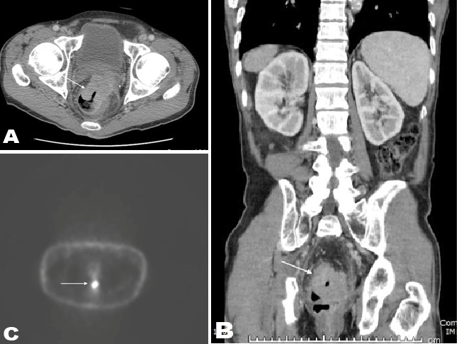 A 56-year-old male with recently diagnosed rectal cancer presented in the emergency department with recurrent seizures and disorientation for some days. Magnetic resonance imaging scan of brain demonstrated hyperintense signal on T2- FLAIR image (Figure 1A) and restricted diffusion on diffusion weighted image (Figure 1B) in right medial temporal lobe. There was no enhancement after contrast administration (Figure 1C). Patient's initial computed tomography (CT) scan of the abdomen and pelvis (Figure 2A-B), and positron emission tomography (PET) scan (Figure 2C) showed the presence of a large rectal mass with intense metabolic uptake. Based on clinical history and imaging findings, diagnosis of PLE was suggested. Serologic investigation showed a highly positive titer for anti-Ri (1:2560, normal <80). Subsequent cerebrospinal fluid analysis also showed increased titers of anti-Ri antibody with no findings to suggest viral or bacterial encephalitis. Since patient was already on chemotherapy treatment for rectal cancer, antiepileptic therapy and steroid treatment were also started. In next few days, the patient was free from seizure episodes and the neurological symptoms gradually improved. Follow-up MRI scan of brain was showed complete interval resolution of the abnormalities (Figure 3A-C). | ||||||