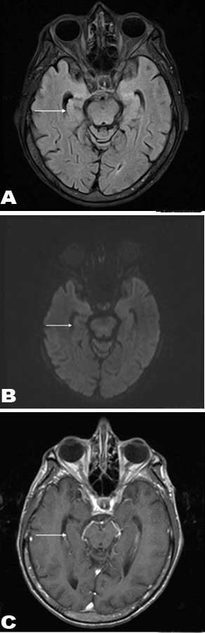 Paraneoplastic neurologic syndromes are a group of neurologic disorders associated with malignancy affecting any part of the nervous system and include PLE, subacute cerebellar degeneration and sensory neuropathy [1]. Paraneoplastic limbic encephalitis one of the paraneoplastic neurologic syndromes, is caused by autoimmune-related inflammatory process localized to the limbic system. It is characterized by slowly progressive behavioral changes, memory loss, seizures and cognitive dysfunction [1]. Small cell lung cancer is most frequent associated malignancy. Other associated cancers include testicular tumors, breast cancer and Hodgkin lymphoma [2]. Infrequently, colon and rectal adenocarcinoma have also been shown to be associated with PLE. The most frequent antibodies are anti-Hu and anti-Ma2 antibodies which can be detected in serum and CSF, thus aiding in diagnosis [2]. Anti-Ri antibody is particularly associated with colon and rectal cancers [2]. As in any other intracranial abnormalities [3] [4], MRI scan is the imaging modality of choice. A brain MRI scan is helpful by demonstrating characteristic MRI finding of high signal intensity in bilateral or unilateral medial temporal lobes on T2-Flair images with mild restricted diffusion. Since DW images show restricted diffusion in the abnormal areas with cytotoxic edema and high cellularity [5] [6], PLE will also show restricted diffusion in most of the cases [7]. MRI scan also helps in excluding other pathologies with similar neurologic symptoms [8]. Differential diagnosis of MRI findings includes herpes encephalitis and low grade glioma. However, herpes encephalitis will usually involve the entire temporal lobe with involvement of the frontal lobe, with presence of hemorrhage in some cases. Low grade gliomas will be unilateral and usually not limited to medial temporal lobe [9]. In difficult cases, history of primary malignancy, serum and cerebrospinal fluid analysis help in making the correct diagnosis. Idiopathic limbic encephalitis can have similar MRI findings as PLE. However, they can usually be differentiated by the presence of high levels of voltage gated potassium channel (VGKC) antibodies serum and cerebrospinal fluid in cases of idiopathic limbic encephalitis [10]. But due to presence of antibodies in some patients with a paraneoplastic origin, the test cannot always be used to exclude a paraneoplastic cause of the limbic encephalitis. Thus, in these cases, overall clinical picture has to be taken into account before reaching the final diagnosis. Graus et al. suggested a diagnostic criterion for PLE which includes: a compatible clinical presentation; <4 years interval between tumor diagnosis and development of neurologic symptoms; exclusion of the other neurological complications of tumor and its treatment; and at least one of the following: MRI demonstrating temporal lobe abnormalities, cerebrospinal fluid with inflammatory changes but negative cytology and PCR for herpes encephalitis, or epileptic activity in the temporal lobe on EEG [11]. EEG findings in PLE include bilateral frontal and temporal intermittent rhythmic delta activity with disorganization and slowing of background activity [12]. Unlike other paraneoplastic syndromes of the central nervous system, PLE is well- known for its good response to therapy. Immunosuppression with methylprednisolone, intravenous immunoglobulin, and plasma exchange has been shown to be useful to control symptoms by reducing the titer of antibodies. However, treatment of associated tumor is most important in neurologic improvement and prognosis [13]. | ||||||