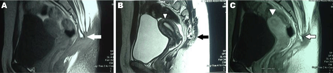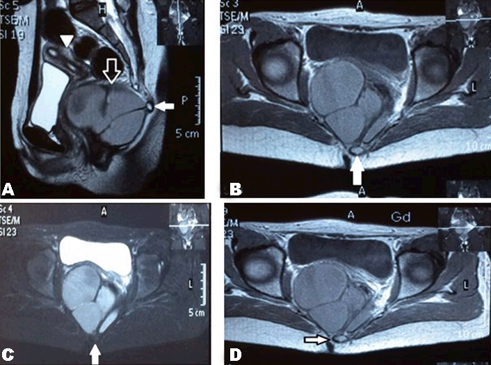 Case 1 History and Examination The patient had a history of a small bulge in the perineum on the right side and a small sinus just below her coccyx during her lifetime. She had no leg pain or paresthesias, no difficulties in urination or defecation, no weight loss, and was able to walk with no difficulties. The patient had an uneventful medical and surgical history with a negative parental consanguinity and a negative family history for same. No irregularities were marked in the menstrual cycle since her menarche at 12 years. In the last two years, she had a decrease in the duration of bleeding (from seven to three days) but with a normal amount of flow. On physical examination, lower limbs revealed normal muscle tone and power, intact sensation, normal reflexes and intact sphincters and rectal mucosa, which was further confirmed by digital rectal examination. A large cystic mass was observed pushing the rectum posteriorly with the mucous membrane moving over it. Diagnostic evaluation Surgery The wound was packed with gauze flavored with iodine and left for secondary healing to take place with regular dressing till 21 days. Histopathological examination Microscopically, the sections showed mature respiratory mucosa, squamous epithelium, mucinous gland and glial elements associated with fibrofatty tissue, bundles of nerve fibers and smooth muscle. It also contained coccygeal bone. The diagnosis was mature cystic teratoma. Outcome Magnetic resonance imaging of pelvis and lumbosacral region revealed it to be free of mass with the restoration of the position of the rectum, bladder and the site of coccygectomy (Figure 4). Case 2 History and Examination The patient had a history of small sinus without discharge below the coccyx. She had no leg pain or paresthesias, no difficulties in urination or defecation, no weight loss and no walking difficulties. The patient had uneventful medical and surgical history with a negative parental consanguinity and a negative family history for same. Her menstrual cycle was regular, with no change in the amount or duration. Her menarche started at 15 years. Physical examination of lower limbs revealed normal muscle tone and power, intact sensation, normal reflexes, intact anal sphincter and normal rectal mucosa, which was further confirmed by digital rectal examination. A cystic mass was found to be pushing on the rectum posteriorly; the mucous membrane was found moving over it. Diagnostic evaluation Magnetic resonance imaging of pelvis and lumbosacral region revealed a large (17×15×10 cm) lobulated outline, hyperintense signal on T1- and T2- with a small (2×10 mm) fatty component near the coccyx, arising from the anterior of lower sacrum and extending posteriorly to the gluteal region more on the right side below the coccyx to the pelvis. It caused displacement of the rectum posterolaterally and uterus and urinary bladder anteriorly. No enhancement was seen after gadolinium contrast (Figure 5). Surgery Histopathological examination A small cyst lined by ciliated epithelial cells was found on one side and squamous epithelial cells on the other, with enteric glandular component seen in the wall of the main cyst. A piece of the bone was present. The diagnosis was chronically inflamed pilonidal sinus with mature cystic teratoma. Outcome | ||||||