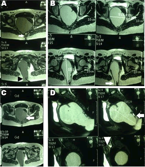 Other studies [2] [9] classified it into mature (cystic or solid, benign), immature (malignant tissue of germ cell origin) and malignant (monodermal or highly specialized) tumors. The sacrococcygeal teratoma in both patients of this study was Altman type IV and both diagnosed histopathologically with mature cystic teratoma. About 90% of the tumor presents with a visible external mass in neonates while most of the adult sacrococcygeal teratoma present as an intra-pelvic mass [2] [7]. Adult sacrococcygeal teratoma may be asymptomatic and discovered incidentally by digital rectal examination, vaginal examination or radiological investigations of the pelvis or peri-anal sinus. However, if the tumor is large enough to produce pressure effect, the patient may complain of pain in the perineum, constipation and bladder dysfunction, and there may be a rare occurrence of fistula in the bladder or rectum [1][2] [9]. Neurological signs and symptoms are absent, and this makes it different from chordoma [1]. The investigations include abdominal and perineal ultrasonography, barium enema to know about bowel involvement and position, urography for the ureter position, arteriography to exclude tumor vascularity, CT scan, and MRI scan with the last two being the investigation of choice [1][2]. We only performed pelvic ultrasonography and MRI for diagnosis. Differential diagnosis includes sacral chordoma, lipoma, anterior myelomeningocele, rectal duplicated cyst and gland cyst, necrotic rectal leiomyosarcoma, pyogenic abscess, neurogenic cyst, cystic lymphangioma, neuroblastomas, dermal sinus stalks, retrorectal hamartomas and intracanalicular epidermoid tumors [2] [7] [8]. The approach to the mass may be trans-abdominal, trans-perineal, a combination of abdominal and perineal approach, combined abdominal sacral approach, or more recently laparoscopic approaches [2] [7][9]. For low-lying presacral tumor by a vaginal approach has been reported in females [1]. We performed complete surgical excision with coccygectomy through sacrococcygeal (posterior sagittal) approach for both patients, with more than 95% cure rate depending on the malignancy [3] [9]. Postoperative complications with coccygectomy are delayed wound healing, infection, increase time for recovery and rare bowel herniation [9]. We did not face postoperative complications except for delayed wound healing. | ||||||