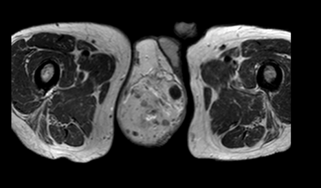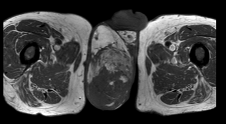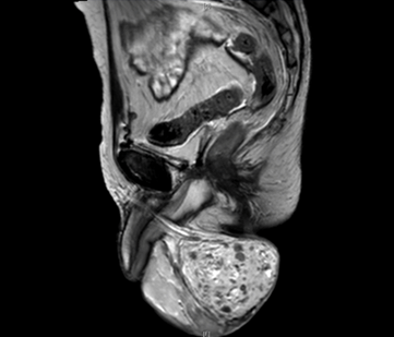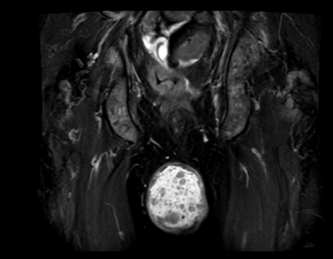 A 55-year-old male diagnosed with prostate cancer in 2010 and underwent radical prostatectomy followed by salvage radiation therapy to the prostatic fossa. He was found to have bone metastasis and since had been treated with hormonal therapy, enzalutamide, abiraterone, radium-223, and taxotere. In April 2016, the patients PSA was >1500 ng/dl. In August 2016, the patient,s was found to have bone marrow involvement with anemia (hemoglobin 6.1 g/dL) and thrombocytopenia (platelets 32x103/ul). In November 2016, the patient began complaining of scrotal pain. Physical examination demonstrated an enlarged scrotum with palpable mass and magnetic resonance imaging (MRI) scan revealed a right testicular hydrocele containing multiple enhancing nodules (Figure 1) (Figure 2) (Figure 3) (Figure 4). At last follow-up on November 10, 2016, the patient continued to have scrotal pain, and required transfusions for anemia and thrombocytopenia and is currently being treated with carboplatin and cabazitaxel. | ||||||