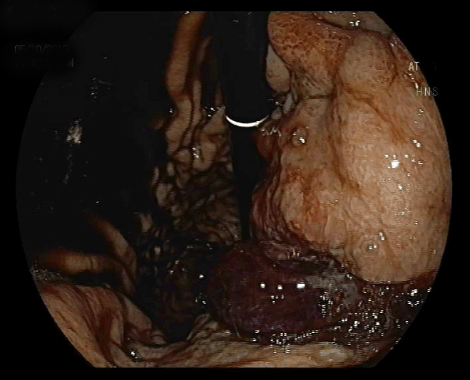 A 38-year-old male with a past medical history of Crohn’s disease, receiving mesalazine and azathioprine therapy for the last three years was admitted to the emergency room with melena. Gastroscopy revealed intact gastric mucosa and bleeding ulcerated advanced gastric cancer (AGC) (Figure 1). The signet ring cell gastric cancer was diagnosed by biopsy.