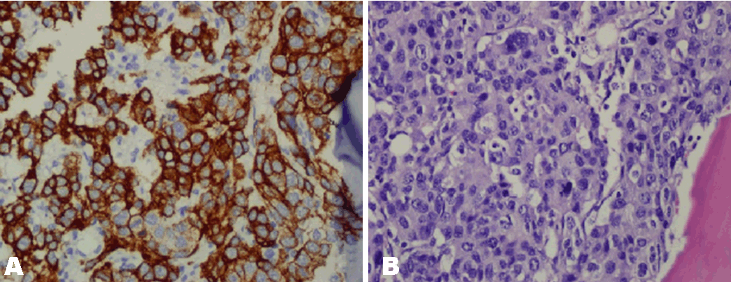 Figure 2: Bone marrow biopsy showing (A) Pan CK7 positivity (magnification: x40), (B) Abundance of signet ring cells (magnification: x40).