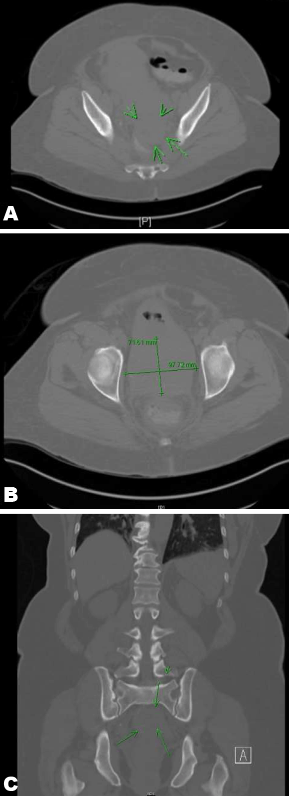 Figure 1: (A–C) Computed tomography scan of abdomen and pelvis. A 7x9 cm mass involving the lower uterine segment and cervix.