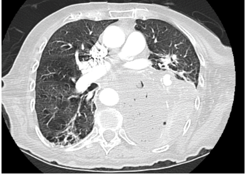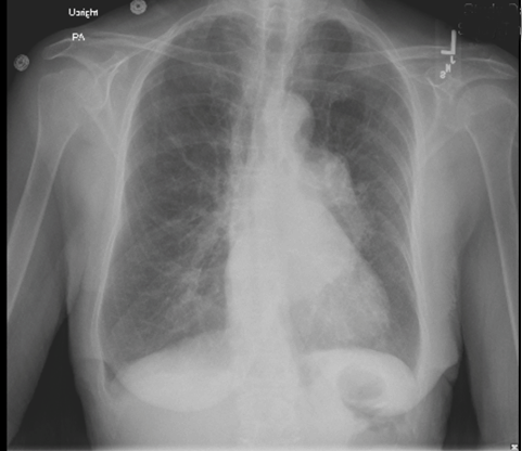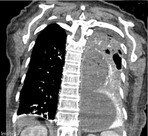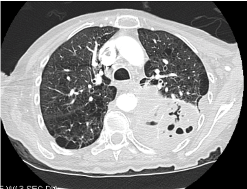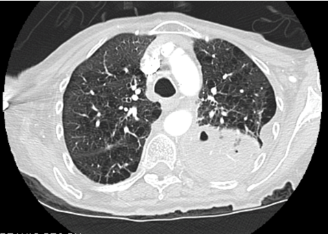 A 77-year-old female, with a 30-pack year smoking history and current 1/2 pack per day smoker, presented to the emergency department with progressive shortness of breath and hemoptysis. The patient had seen her primary care provider one week prior to arrival and was advised to have a computed tomography scan of the chest, which showed 8x4.6x10.4 cm cystic/necrotic septated mass in the left posterior mediastinum. There was also mass effect of adjacent structures including the left lower pulmonary vein which demonstrated a thrombus within the lumen (Figure 1) (Figure 2). She was started on apixaban for this questionable tumor extension versus bland clot. Hemoptysis had become significantly heavier since starting Eliquis, so she came to the emergency department for further evaluation. A fine needle aspiration (FNA) with endobronchial ultrasound (EBUS) was performed, and after removal of a mucus plug in the left lower lobe, brisk bleeding occurred. Hemostasis was achieved with an endobronchial blocker and biopsy of the mass was taken. Histological examination of the biopsy specimen showed a high grade spindled and epithelioid malignant cells with associated blood vessels and extensive necrosis. Immunohistochemical staining of the tumor revealed it was strongly positive for CD31, vimentin, and cytokeratin, suggestive of epithelioid angiosarcoma. Imaging did not reveal additional sites of malignancy, and a diagnosis of primary pulmonary angiosarcoma was made. The patient was not a surgical candidate based on the size and complexity of the tumor, along with the poor performance status. Radiation oncology was consulted for further management and radiation treatments were started. After five-doses of radiation, patient was discharged to short-term rehab facility. Within one month of discharge, patient returned to the emergency department with worsening cough, shortness of breath, hemoptysis and performance status. The patient received 65% of planned radiation treatments prior to arrival. Computed tomography scan of the chest revealed a 14x9x6 cm large mass like structure in the left lower lobe containing complex fluid and multiple pockets of air suggestive of an infected or necrotic tumor (Figure 3) (Figure 4) (Figure 5). Based on the progression and aggressiveness of the tumor, the patient decided to go on hospice. Shortly after, the patient died from respiratory failure. | ||||||
