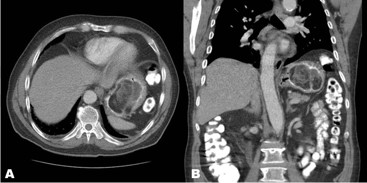 The patient is a 79-year-old male who presented to the emergency department for intermittent right upper quadrant abdominal pain with reported hematemesis and melena. His abdomen was soft and no masses were palpated. Serology was notable for a hemoglobin of 7.8 g/dl and hematocrit of 26.6%. The patient was admitted to the Internal Medicine service with the diagnosis of upper gastrointestinal bleed. Computed tomography (CT) examination with IV and PO contrast demonstrated a large mixed fat and soft tissue density intraluminal gastric mass (7.9x5.6x7.2 cm) originating from the greater curve consistent with a well-differentiated liposarcoma (Figure 1). No extraluminal extension was evident and no lymphadenopathy or metastases were present.
