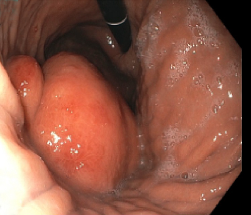 Subsequent endoscopy identified a large, partially obstructing submucosal gastric mass located posteriorly along the greater curvature near the fundus (Figure 2). Initial biopsy attempts were unsuccessful and non-diagnostic. Repeat biopsy was concordant with radiological findings and revealed a well-differentiated fatty neoplasm with MDM2 amplification on tissue section.