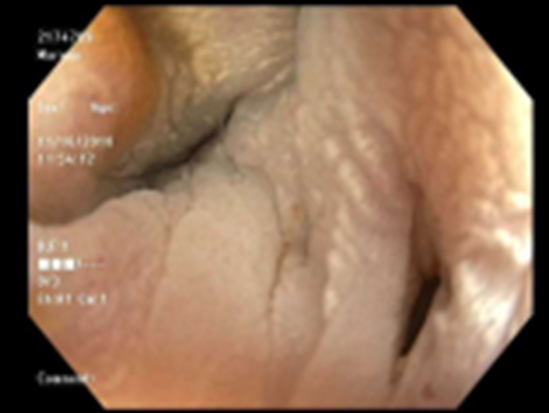 The patient then returned complaining of recurring abdominal pain. A second CT scan showed the abscess recurred in similar location to the primary (Figure 2). Since the second abscess was in the same location, the surgeon wanted a colonoscopy. The colonoscopy showed: “A severe stenosis measuring of unknown length was found in the descending colon (60 cm from anal verge) and was non-traversed. Biopsies were taken with cold forceps for histology. The exam was otherwise normal throughout the examined colon” (Figure 3), (Figure 4), (Figure 5). Biopsy performed showed highly atypical glands invading lamina propria, invasive adenocarcinoma.