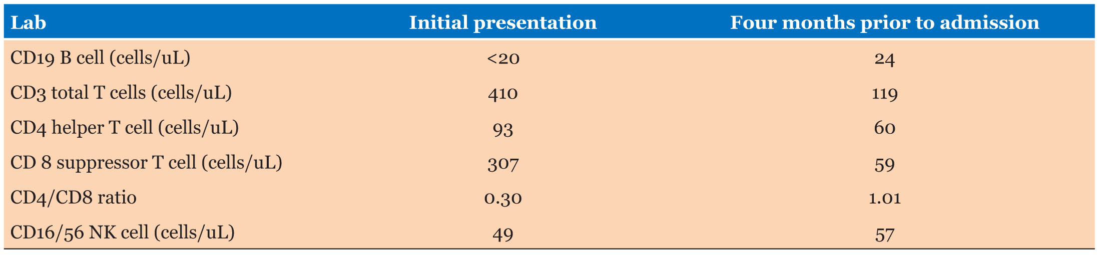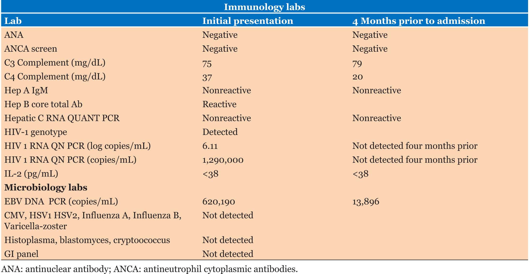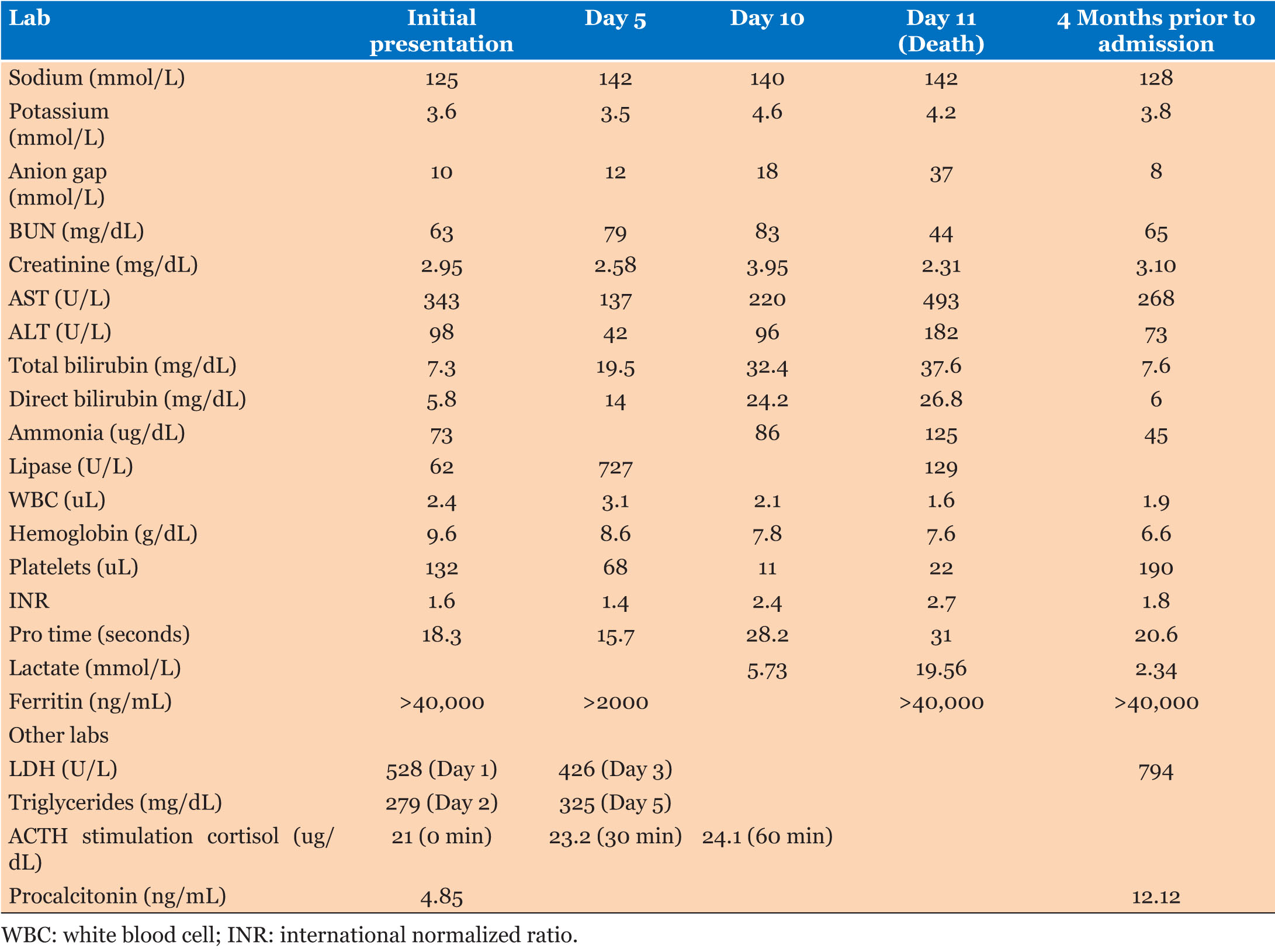 Over the next 11 days, the patient quickly declined and went into multiple organ failure. He initially presented as alert and oriented, but prior to death was very lethargic, not oriented to self, place, or time, was unable to answer questions, and had difficulty following commands. Jaundice and scleral icterus worsened. His abdomen remained distended and diffusely tender with palpation. Peripheral edema was noted in his bilateral lower extremities. He also had ongoing singultus, which was refractory to baclofen and thorazine. He was continuously hypotensive requiring norepinephrine and vasopressin, but remained afebrile. Acyclovir, piperacillin-tazobactam, and linezolid were discontinued due to acute renal failure and atovaquone, meropenem, and micafungin were initiated along with continued home highly active antiretroviral therapy (HAART). He had a full workup to rule out an infectious or immunologic etiology for his presentation (Table 2 and Table 3). His blood cultures and urine cultures were negative. Epstein–Barr virus reactivated and was 620,190 copies/mL, HIV quantitative polymerase chain reaction (PCR) was 1,290,000 copies/mL, HBV core was reactive, ferritin was greater than 40,000 ng/mL, and CD4 count was 93 cells/uL. Cytomegalovirus, Histoplasma, blastomycosis, and hepatitis C virus (HCV) were negative. Procalcitonin was 4.84 ng/mL.