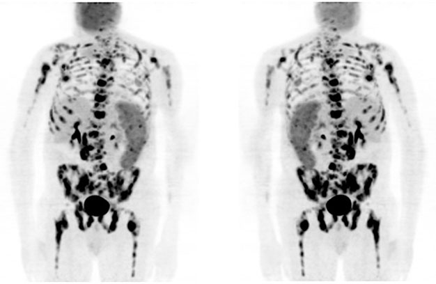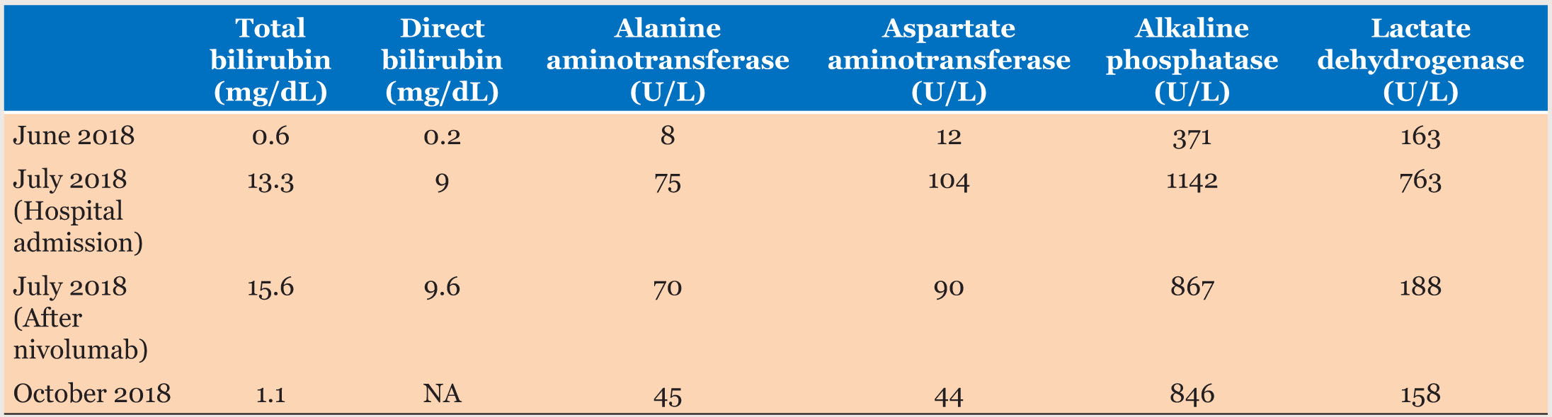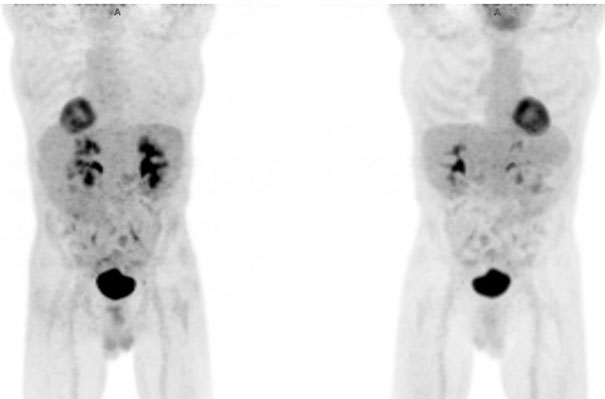 A 65-year-old man with HIV on highly active antiretroviral therapy (HAART) presented with recurrent classical Hodgkin lymphoma (cHL) and visceral crisis. His initial diagnosis was in 2010 when he was treated with 6 cycles of adriamycin, bleomycin, vinblastine, dacarbazine (ABVD) achieving complete remission. The first recurrence was in 2017 when he had extensive lymphadenopathy, splenomegaly, and innumerable osseous lesions. He received 6 cycles of brentuximab, achieving a near-complete remission by April 2018. He subsequently presented in July 2018 with extensive disease relapse, confirmed by excisional lymph node biopsy, and marrow exam documenting 80% replacement of bone marrow by cHL. A PET/CT imaging showed marked progression at multiple sites (Figure 1). At that time, total bilirubin was elevated at 13.3 mg/dL, and alkaline phosphatase of 1142 U/L. His CD4 count was 53 cells/uL. He was treated with nivolumab, receiving only a single dose of 240 mg. However, he was readmitted to the hospital one week later due to significant clinical deterioration, pancytopenia, and progressively worsening liver failure. The total bilirubin escalated to 15.6 mg/dL. He was treated with steroids for possible nivolumab-induced liver injury, and discharged home after a prolonged hospital stay, with hospice care recommended. However, he recovered slowly, without further treatment of HL, and on follow-up after eight weeks he had completely recovered liver function (Table 1). A restaging PET/CT imaging showed a complete response without any evidence of disease (Figure 2). The bone marrow exam was repeated and showed no residual HL. His CD4 count continues to be low at 98 cells/uL, and he is continuing HAART therapy. He is followed closely and the plan is to resume checkpoint inhibitor therapy at disease recurrence.