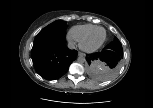 Computed tomography (CT) of the chest revealed a large spiculated mass in the left lower lobe measuring 7.2 cm in dimension and concerning. A follow-up transbronchial biopsy revealed fragments of lung parenchyma with atypical infiltrative glands adjacent to a fragment of ciliated respiratory epithelium and a background of desmoplastic reaction. These glands demonstrated atypical nuclei with membrane irregularities, some prominent nucleoid and increased mitoses. Performance of immunohistochemistry showed malignant cells positive for CK7 and focally positive for CK20 and CDX2. The malignant cells were negative for TTF-1, napsin, p40, CK5/6, and Pax-5, reflective of adenocarcinoma. This data, however, initially confused the primary source. Based on the immunohistochemical profile, the source might have been a primary lung or an upper aerodigestive or pancreaticobiliary adenocarcinoma. Staging with proton emission tomography (PET) demonstrated an area of increased metabolic activity within the wall of the cecum and the ascending colon. Given the immunohistochemical profile along with the area of enhancement, an upper endoscopy and colonoscopy were performed. These studies returned without evidence of mass or nodules. After review, the clinical and radiographic picture was most consistent with primary lung adenocarcinoma with metastatic pulmonary nodules in the right upper and lower lobes along with additional nodules in the left lower lobe independent of the spiculated mass.