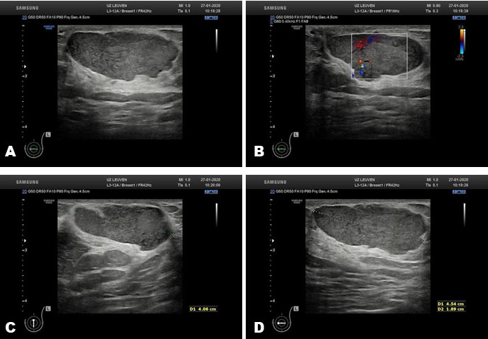 A 48-year-old woman presented at our institution with a palpable retro-areolar lump in the left breast. On clinical examination the lump was about 4–5 cm in size, painless, and without any skin changes or nipple retraction. No nipple discharge could be provoked. Right and left mammograms were obtained (Figure 1A, Figure 1B, Figure 1C, Figure 1D). Both breasts showed a breast imaging-reporting and data system (BI-RADS) density C. The right breast was normal. In the left breast, a mass in a retro-areolar location was visible. Other characteristics were an oval shape, high density, and circumscribed margins. Measurements were 44 × 24 × 41 mm. No calcifications or associated skin changes were seen. Additional ultrasound of the left breast showed an oval retro-areolar mass with parallel orientation in relation to the pectoral muscles (Figure 2A). The lesion showed overall circumscribed margins with a few angulations. Echo pattern was hypoechoic, with moderate internal vascularization on color Doppler and a few small cystic components (Figure 2B and Figure 2C). The lesion showed slight posterior enhancement. Measurements were 45 × 19 × 41 mm (Figure 2B, Figure 2C, Figure 2D). No axillary lymphadenopathy was identified. Due to age and the presence of a new palpable soft tissue mass additional, core biopsy (3 × 18 Gauge) was performed and BI-RADS 4a category was assigned.