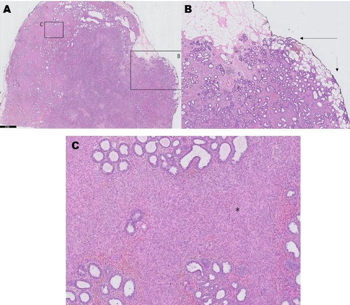 The core needle biopsy was composed of three non-fragmented tissue cylinders in which a FEL with a predominant pericanalicular growth pattern and a cellular stroma was recognized. The stroma to epithelial ratio was homogeneous and the stromal component showed no atypia, nor mitotic activity. The diagnosis of a cellular fibroadenoma was suggested, on which surgical excision was performed. The resection specimen was composed mainly by areas strongly resembling a cellular FA as observed in the needle biopsy. However, focally the stromal component was expanded with sudden increase in cellularity with presence of cellulated cuffs of stromal cells around the epithelial ducts. In this region the stroma to epithelial ratio was increased, but no evidence of stromal overgrowth was recorded (i.e., microscopic field that at low power magnification shows only stromal components without the epithelial ones). These findings were highly suggestive of a periductal stromal tumor. Moreover we also observed pushing borders and focal infiltrative growth in the surrounding breast tissue (Figure 3A, Figure 3B, Figure 3C). Because there was a focal impression of a leaf-like architecture in relation to a dilated duct, we preferred the diagnosis of a borderline phyllodes tumor possibly originating from a cellular fibroadenoma. Next-generation sequencing (NGS) mutation analysis was attempted to try to support this diagnosis on a molecular level, but unfortunately there was an insufficient amount of intact DNA. The resection was incomplete toward the caudal and lateral margins. Therefore, re-intervention with local excision with wide margins was performed. The re-excision showed scarring and steatonecrosis as a result of the previous procedure, but no residual FEL. Consequently, there was no need for further surgical intervention.