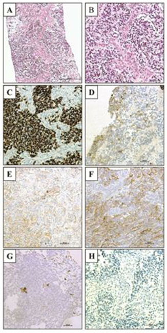 Because of the tense ascites, 4 L was aspirated and was sent for cytological examination, which showed the presence of atypical cells. The patient underwent ultrasound (US)-guided biopsy from the liver mass. A sheet of round small cells was observed. Based on the liver biopsy, our pathologist recognized a desmoplastic stroma between the cells.