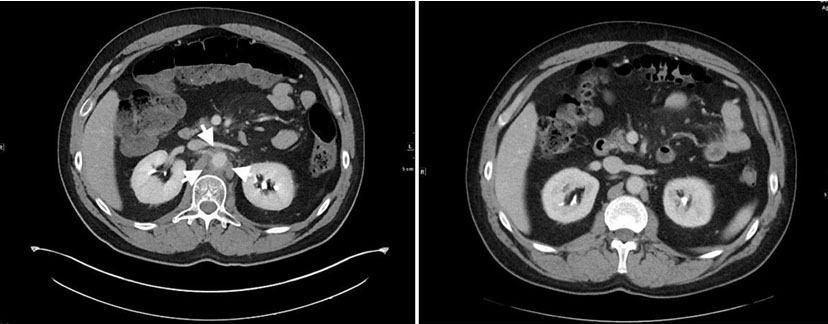 This is a man who presented in April 2017 with left upper quadrant abdominal pain. Computed tomography (CT) of the abdomen showed a mass in the tail of the pancreas and diffuse liver metastases. Pathology from the liver biopsy showed a high-grade neuroendocrine cancer with numerous mitotic figures and apoptotic bodies, and Ki-67 proliferation index of 90%. Chest CT was negative. The patient’s tumor underwent genomic analysis in May 2017 utilizing FoundationOne, a next-generation sequencing (NGS) based assay. The assay performed on his sample interrogated 315 genes as well as introns of 28 genes involved in rearrangements. Genomic alternations identified in his sample included RB1 loss exons 18–27 and GABRA6 V2281. The patient received 7 cycles of carboplatin and etoposide and obtained a complete radiographic response. In October 2018 he developed a recurrence in the liver and was retreated with carboplatin and etoposide with the addition of the PD-L1 inhibitor atezolizumab. After two cycles of therapy, administered at 21-day intervals, he developed abdominal pain. Computed tomography scan showed inflammation and stranding around the aorta consistent with aortitis. Prednisone was initiated, 1 mg/kg and the pain resolved within a week. He continued treatment on chemotherapy alone while receiving a 2-month prednisone taper. After 6 cycles of chemotherapy, he again achieved a remission. Three months after discontinuation of therapy he recurred with diffuse liver metastases. Atezolizumab was reinitiated with carboplatin and etoposide. After two cycles, he again developed severe abdominal pain. Computed tomography scan (Figure 1) showed interval development of significant inflammatory fat stranding and soft tissue thickening about the abdominal aorta, most notably at the level of the renal arteries. Inflammatory stranding extends along the spinal muscular atrophy (SMA) (Figure 2), consistent with recurrence of aortitis. Steroids were instituted and the aortitis resolved. The patient had subsequent recurrences bud did not respond to treatment with topotecan and subsequent treatment with lutetium Lu 177 dotatate. In December 2020, he had continued disease progression. Treatment with cisplatin, etoposide, and the PD-1 inhibitor pembrolizumab was started. He has had 6 cycles of combined chemoimmunotherapy without recurrence of aortitis and had a partial remission.