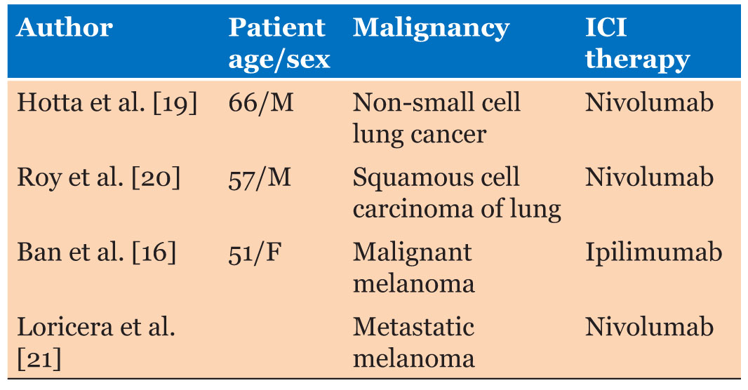 Friedman CF, Proverbs-Singh TA, Postow MA. Treatment of the Immune-related adverse effects of immune checkpoint inhibitors: A review. JAMA Oncol 2016;2(10):1346–53. [CrossRef]