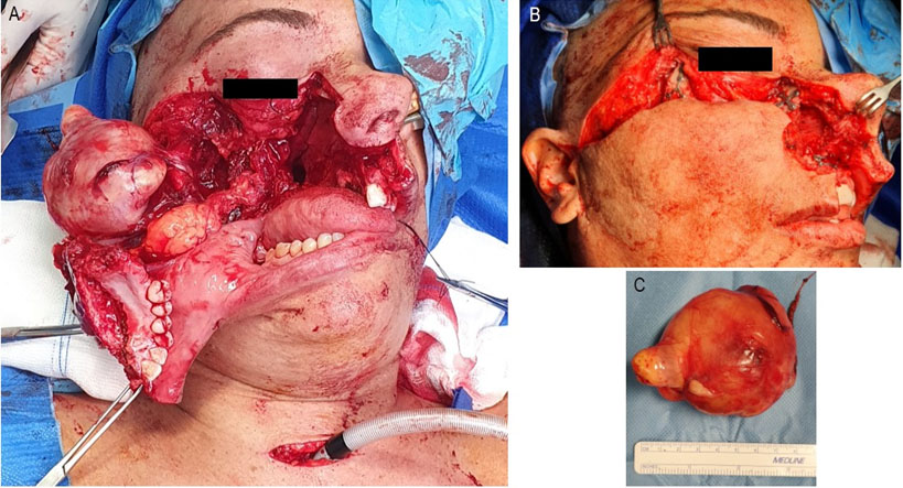 Excision of the right IF lesion by maxillary swing approach with previous tracheotomy was performed. Weber-Ferguson incision with lateral subciliary extension to the tragus was made. After lifting subcutaneous tissue, osteotomies were performed at the level of the alveolar and frontal process of the maxilla, orbital floor and zygomatic apophysis. A paramedian incision was made along the hard palate to the level of the soft palate and laterally to the maxillary tuberosity. Subsequently, osteotomy was performed with pterygo-maxillary disjunction and fully swung of the maxilla and exposure of the neoformative lesion. After tumor resection, the maxillary bone was repositioned and osteosynthesis was performed (Figure 2).