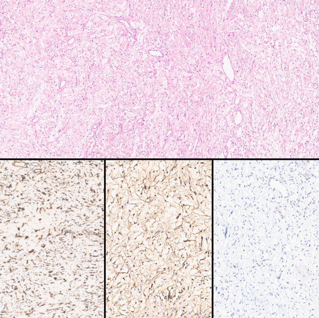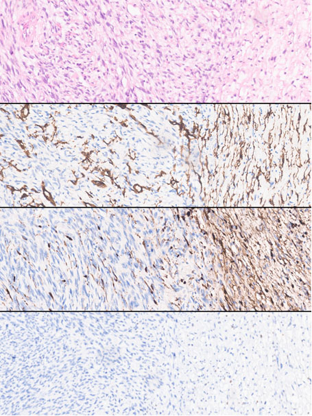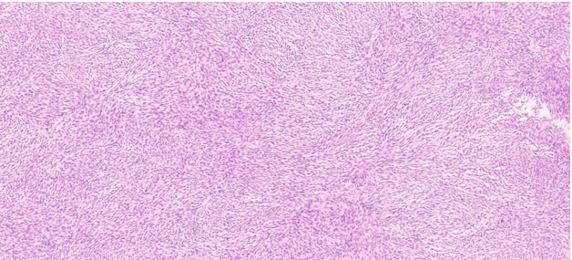 The anatomopathological evaluation of the lesion revealed a neoplasm measuring 7 cm with two different areas. In the peripheral area there were loosely arranged spindle cells with an haphazard arrangement, wavy nuclei, and no cytologic atypia that stained positive with CD34, S100, and H3K27me (Figure 3). The former area had an abrupt transition to a different zone of the tumor in which there were hypercellular fascicles and broad whorls of uniform, spindled cells with hyperchromatic nuclei and numerous mitosis that did not stain with CD34, S100 nor H3K27me (Figure 4 and Figure 5). These findings were compatible with a high grade MPNST arising within a neurofibroma (Figure 5).