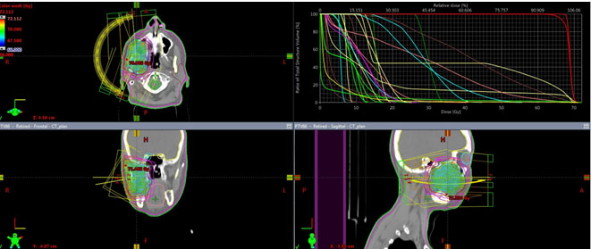 The excision was juxtalesional and the tumor was staged at pT3cN0M0, IIIB. The patient had adjuvant radiotherapy with 66 Gy in 33 daily fractions of 2 Gy delivered to the tumor bed, volumetric modulated arc therapy (VMAT) technique. Clinical tumor volume (CTV) was contoured on the planning CT after registration with diagnostic MRI and PET/CT. Planning target volume (PTV) was obtained by adding a 4 mm margin to CTV. Relevant organs at risk (OAR) were also contoured. Dose-volume histogram (HDV) analysis shows V100 of 95.4% for PTV and 100% for CTV (Figure 6). All OAR constraints were respected except for homolateral parotid gland, with 41.5 Gy mean dose.