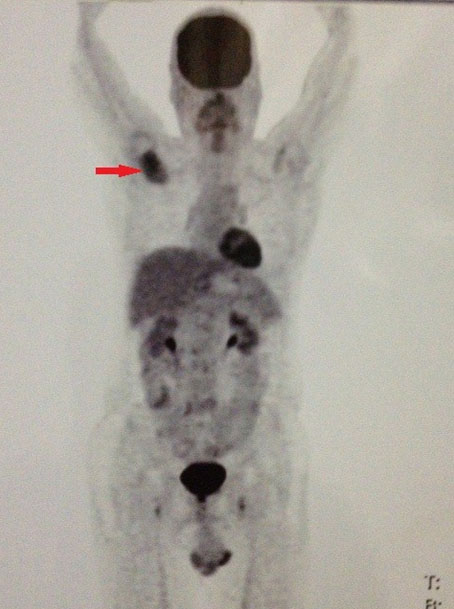 A 62-year-old man presented with pain and gradually increasing swelling of the right scapular region for four months. On examination, there was a bony hard swelling on the scapula with no restriction of movement. Magnetic resonance imaging (MRI) showed a destructive lesion in the spine of the scapula (Figure 1). Whole body 18-Fluoro-deoxy-glucose positron emission tomography (FDG-PET) showed a non-FDG avid lesion in the spine of the scapula, with no other metabolically active lesion identified elsewhere (Figure 2). The spine of the scapula was surgically resected with adequate margins. Histopathology revealed a neuroendocrine tumor (NET). Lesional cells showed diffused string immunopositivity for pan cytokeratin (pan CK) an epithelial cell marker and markers of neuroendocrine differentiation, chromogranin and synaptophysin (Figure 3). Upper and lower endoscopies were negative for a primary gastrointestinal NET. Postoperatively, the patient did not receive any adjuvant therapy. The patient was followed up over four years and has remained disease free, clinically and radiologically.