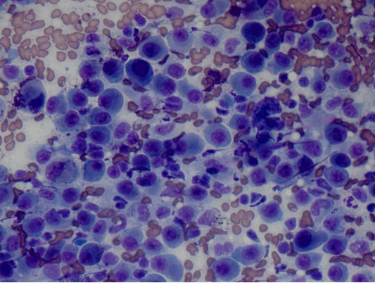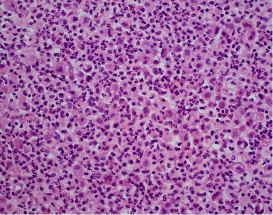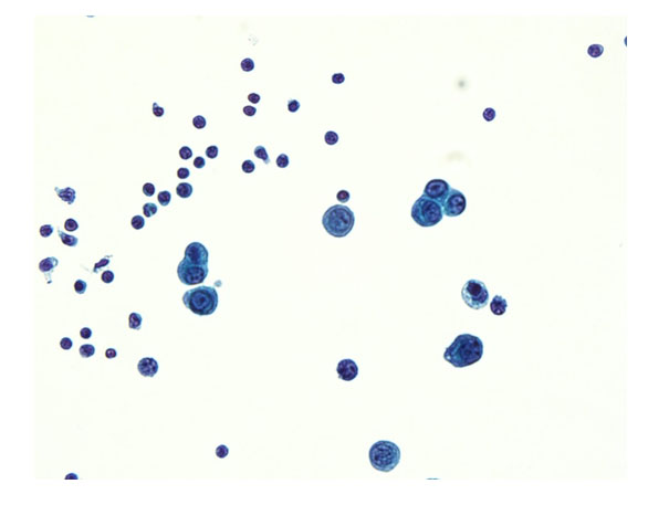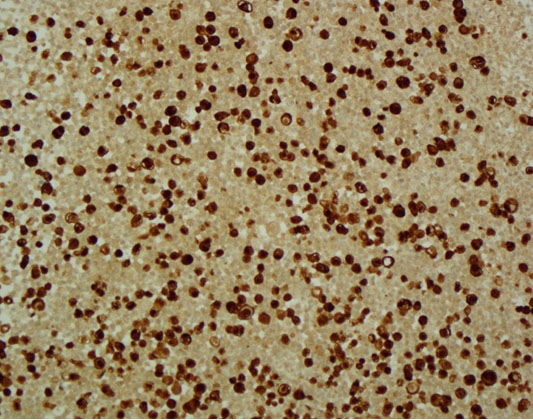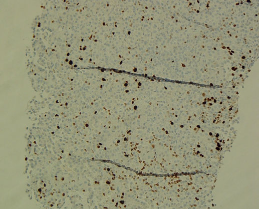 The patient was admitted to the hepatology inpatient service with consults from rheumatology, infectious disease, hematology, nephrology, pulmonology, and interventional radiology for a multidisciplinary approach to management. He underwent paracentesis followed by thoracentesis and an ultrasound guided peritoneal nodule biopsy. Turbid white chylous fluid (1200 mL) was removed from the left chest. The initial clinical impression from pulmonary was that the bilateral chylous effusion was likely secondary to superior vena cava syndrome and left brachiocephalic obstruction caused by lymphadenopathy. He was commenced on a low cholesterol diet and nutrition was consulted. Laboratory results from the first peritoneal tap showed atypical mesothelial cells indeterminate for malignancy (Figure 2). Subsequent thoracentesis (Figure 3) and paracentesis (Figure 4) specimens had higher cellular yield and revealed highly atypical mesothelial cells with high nuclear to cytoplasmic ratios and prominent nucleoli suggestive of malignant mesothelioma. Tumor cells were immunoreactive with Calretinin immunohistochemistry stain (Figure 5) which supported mesothelial origin rather than an epithelial origin (carcinoma). The diagnosis was further confirmed by an ultrasound guided peritoneal nodule biopsy which showed a consolidation of epithelioid tumor cells consistent with malignant mesothelioma, epithelioid type (Figure 6). Immunohistochemical staining of the omental biopsy for Ki 67 staining showed a high proliferative index > 10% (Figure 7). The tumor also contained foci of inflammatory cells including many plasma cells. These inflammatory cells could be reactive to the tumor or related to an underlying autoimmune or inflammatory process.