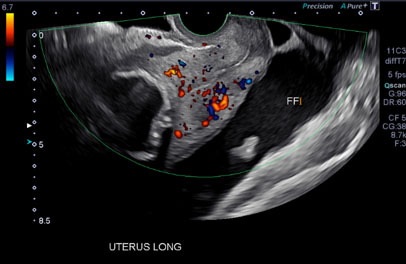 A subsequent transvaginal ultrasound showed a large volume of free fluid within the pelvis, a soft tissue nodule separated but superior to the left ovary with Doppler flow, and an enlarged uterus with a calcified fibroid (Figure 2).