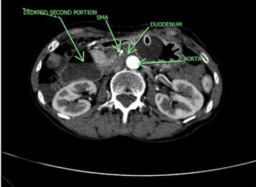The treatment consists on the thickening of the retroperitoneal fat mass that allows the release of the duodenum. This entails dietary measures such as fractioning meals, changes in consistency, and postural management, to allow the passage of intestinal contents distally. More advanced measures are the use of enteral nutrition through nasojejunal tube, jejunostomy, or supplemental parenteral nutrition [7]. It is not clear how much weight must be gained to recover retroperitoneal fat mass, so symptoms must be monitored until they subside.