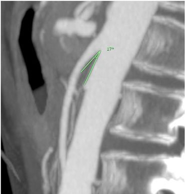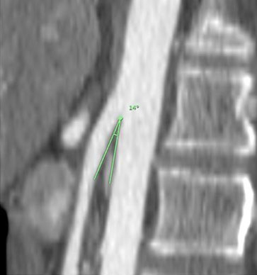 The patient presented intense epigastric pain, vomiting, and constipation, requiring hospitalization. Symptoms subsided when lowering enteral nutrition infusions up to 20 cc/h, and exacerbated when enteral nutrition volume was increased. The physical exam showed a normal abdomen, no distension, soft, with slight sensitivity at the epigastrium and no signs of peritoneal irritation. By this time, the patient’s weight was 36 kg, reaching a body mass index (BMI) of 16.8 kg/m2. An upper digestive endoscopy showed an esophageal stricture with actinic appearance, requiring endoscopic dilation. However, since stenosis does not explain the feeding intolerance, a CT scan was performed. It reported a significant decrease in intra-abdominal fat, especially in the retroperitoneal fat panniculus, associated with a change in caliber and dilation of the second and third portion of the duodenum (Figure 1 and Figure 2), possibly due to partial compression of the third portion between the aorta and the SMA. No other signs of intestinal obstruction were observed. Superior mesenteric artery syndrome was suspected so the images were reviewed with the radiologist, finding an aorto-mesenteric angle of 17° (Figure 3) and an aorto-mesenteric distance of 7.3 mm (Figure 4).