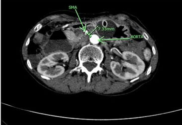 Superior mesenteric artery syndrome is an infrequent entity, not broadly known. It was first described in 1861 by Carl Freiher von Rokitansy in autopsies and, later, Wilkie published a series of 75 cases in 1927 [6]. Because the symptoms caused are common with other pathologies, it is important to have a high index of suspicion to make the diagnosis.