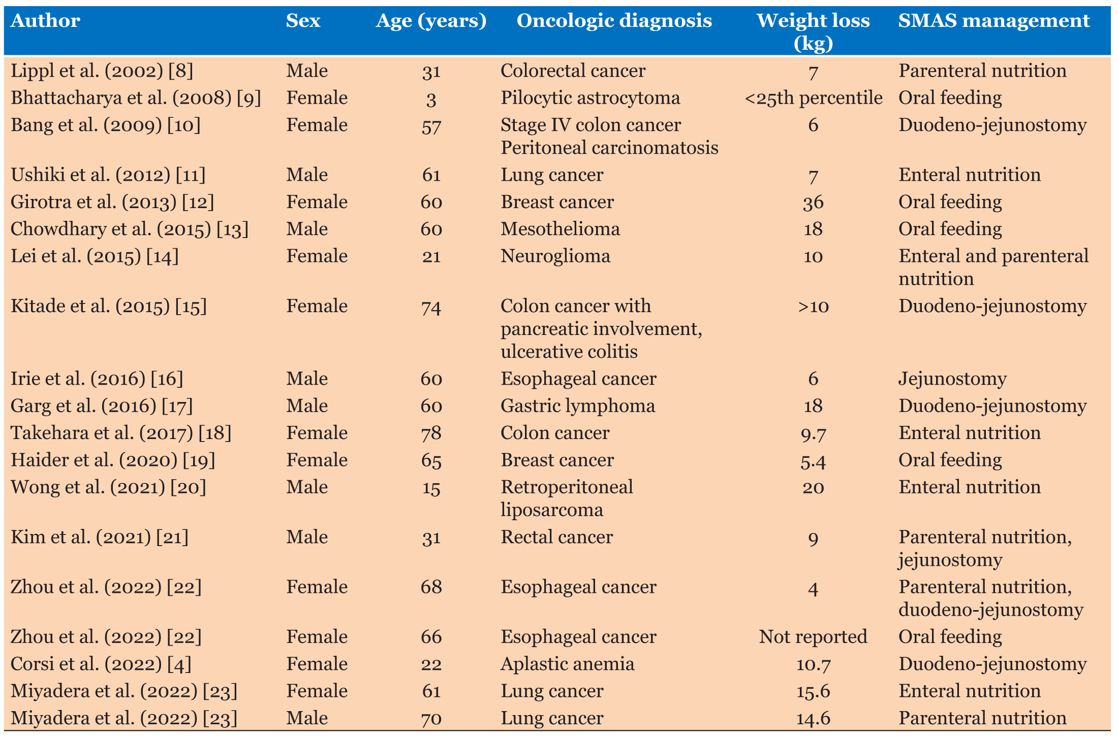 The SMAS has been more frequently described in young patients with a history of weight loss, in the context of spinal surgeries, anorexia nervosa, or even bariatric surgery. Although nutritional compromise is common in oncology patients, case reports of patients with SMAS are scarce [4]. We conducted a literature search in PubMed and Google Scholar, using the terms “superior mesenteric artery syndrome,” “Wilkie’s syndrome,” “oncology,” “cancer,” and “weight loss.” To our knowledge, only 16 cases of oncology patients with SMAS have been reported to this date in the literature, and are listed in Table 1.