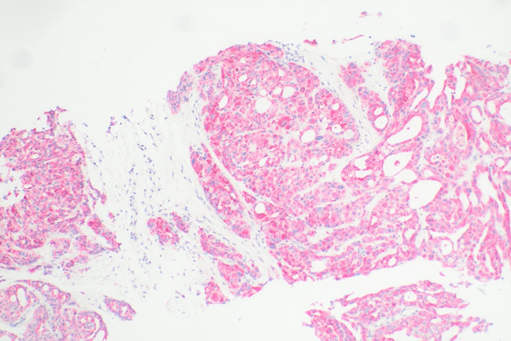 The patient was then referred to surgery for further work-up. A right breast ultrasound showed no breast abnormalities but found enlarged, suspicious right axillary lymph nodes. A subsequent positron emission tomography (PET) scan showed hypermetabolic right axillary lymph nodes and cutaneous fludeoxygluoce-18 uptake in the right axilla. Surgery proceeded with an ultrasound-guided percutaneous core needle biopsy of the largest enlarged lymph node; it measured 2 cm in diameter. Immunohistochemical staining results of the core needle biopsy showed no ER, PR, CK-20, TTF-1, p40, and CD117 expression. HER2, CK-7, GATA-3, and a-methylacyl CoA racemase (AMACR), also known as p504s, were positive in immunohistochemistry. The pathology report noted that while the immunophenotypic profile was suggestive of a breast primary lesion, reactivity for p504s (Figure 1) raised the possibility of apocrine differentiation of adnexal origin.