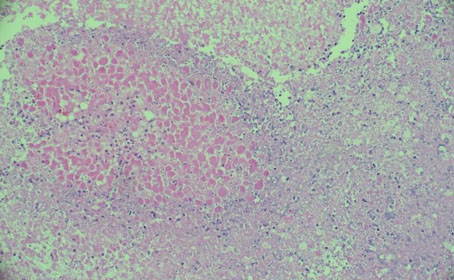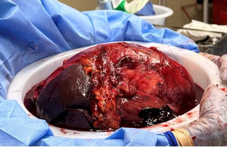 The histological characteristic of OAC is the presence of large polygonal cells with abundant eosinophilic cytoplasm, as a result of mitochondrial accumulation [3]. The diagnostic criteria used for ACC, the Weiss system, overestimates malignant potential in oncocytic tumors, therefore a separate classification system called the Lin–Weiss–Bisceglia (LWB) classification is used for oncocytic tumors [5],[8]. The LWB system divides oncocytic adrenocortical neoplasms (OANs) into benign, borderline, and malignant categories based on three main criteria: a mitotic rate greater than 5 per 50 high-power fields, vascular invasion, and metastasis. Malignancy is diagnosed if any of these criteria are present, while borderline tumors show only minor criteria, such as a tumor size greater than 10 cm, necrosis, or capsular invasion. This classification system has enhanced the ability to differentiate between benign oncocytic adenomas and OACs. In our patient, the resected specimen showed a well-circumscribed tumor weighing 5458 g, and measuring 26.0 × 25.0 × 16.0 cm. The tumor also had extensive hemorrhage and necrosis, along with a central fibrous scar [9]. Microscopically the patient’s tumor matched the classic histological findings for OAC and exhibited a low Ki-67 index of 2% suggesting a low proliferative rate. However, the tumor did exhibit vascular (renal vein) and capsular invasion (Figure 3, Figure 4, Figure 5, Figure 6). Based on the LWB criteria, malignancy was established due to the vascular invasion. Next-generation-sequencing (NGS) showed TP53 pathway alterations. The malignancy had a low tumor mutation burden and was found to be microsatellite stable. These findings are consistent with recent research suggesting a distinct mitochondrial metabolic profile with an oncocytic variant of ACC [4].