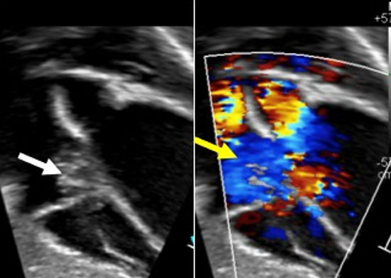 An asymptomatic 2-year-old female was referred to pediatric cardiology for evaluation of a murmur at the left lower sternal border. On examination, she had a harsh III/VI holosystolic at the left mid-sternal border prompting further evaluation.