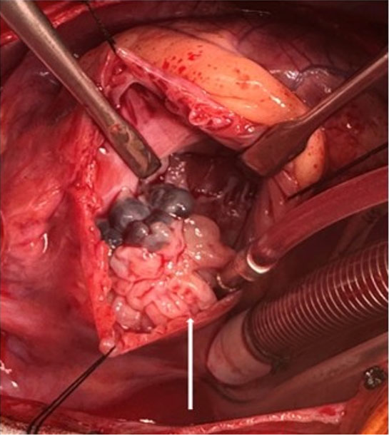 Ultimately resection was recommended for definitive diagnosis and therapy. Intra-operatively, a large 26 × 17 × 15 mm multi-lobular polypoid mass (Figure 3) stemmed from the septal leaflet of the tricuspid valve by the anteroseptal commissure. The valve was reconstructed using autologous pericardium. Post-operative transesophageal echocardiogram showed a well-functioning tricuspid valve. Tissue histopathology identified avascular fibroelastic tissue surrounded by a thin layer of endocardium, consistent with papillary fibroelastoma (PFE). The patient remains asymptomatic at follow-up with a well-functioning tricuspid valve.